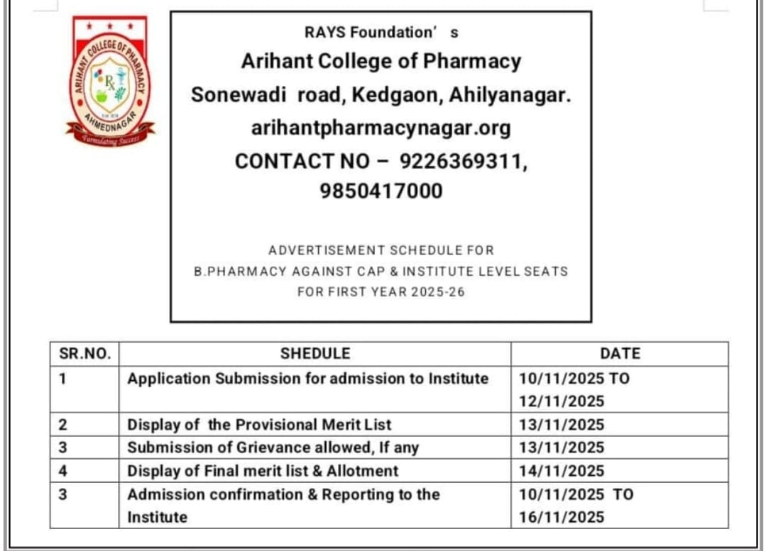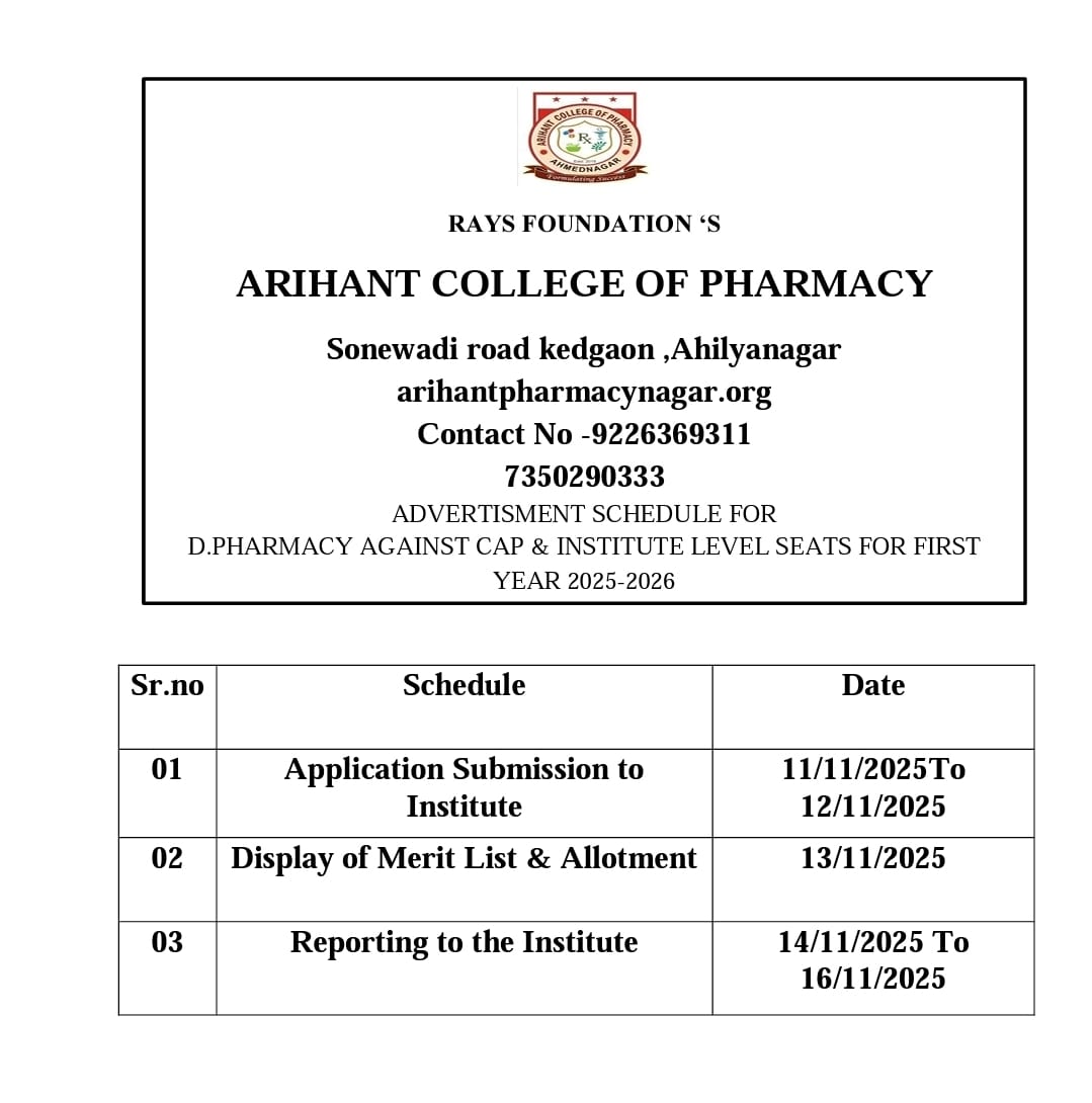 B Pharm and D Pharm Admission Process Start for Year 2025-2026 any Query Contact to Arihant College of Pharmacy